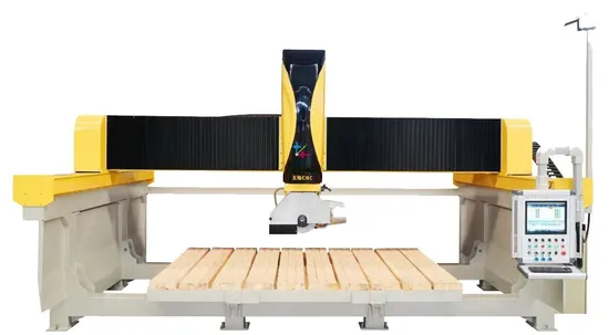 This CNC stone cutting machine is a mono-bloc 5-axis CNC machine. Besides straight cutting, this CNC stone cutting machinery is also able to make polygon cutting, straight/arc stone line cutting, curve cutting, vanity top cutting, internal/external round shape cutting and chamfering.