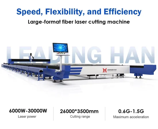 Introducing the Ground Rail Large-Format Fiber Laser Metal Cutting Machine - a groundbreaking solution designed to replace traditional oversized cutting methods. This advanced BH series model features an exceptionally large working table that can handle sheets up to 26,000mm by 3,500mm. It perfectly integrates user-friendly operation, robust safety features, and cutting-edge intelligent connectivity to deliver unparalleled precision and efficiency. Ideal for various mechanical manufacturing and processing industries, this machine excels in cutting large, thick metal sheets with high power and accuracy. It is compatible with a wide range of materials, including carbon steel, stainless steel, galvanized steel, iron, aluminum, copper, gold, and silver alloys. Experience the next level of metal cutting technology with the BH series.