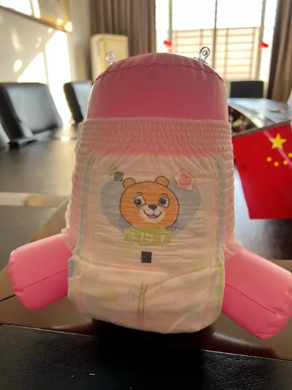 | Product structure | upper&lower tissue(or airlaid),Cotton core(mix with SAP),Topsheet hydrophlic nonwoven, ADL, Leak cuff hydrophilic nonwoven,3D core coating, Back sheet, Waist nonwoven, Printed cartoon tissue, Waist elastic, S elastic,Easy tape. |