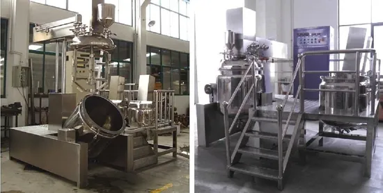 The vacuum emulsifying mixture is mainly composed of water pot,oil pot,emulsify pot,vacuum system,lifting system(optional),electric control system(PLC is optional),operation platform,ect.