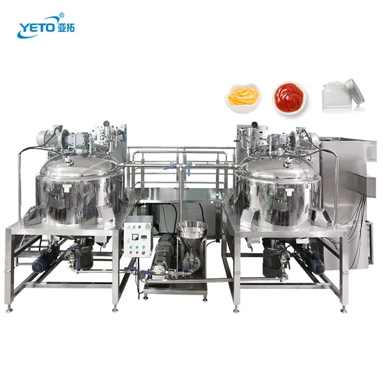 Cosmetic factory Moisturizing Lotion Vacuum Emulsifier Bottom Homogenizer Mixing Making Machine This fixed-type vacuum emulsifying machine is suitable for large-volume production of products, fixed means that its lid is connected with the pot body and can not be separated.No lifting system ,so the machine height is lower than hydraulic lifting vacuum emulsifying machine and price is more competitive. And this project is customized according to our customer's requires.It is used for producing Mayonnaise,top mixing and bottom homogenizer is for emulsifing and make the mixture will at a high level quality.The rotor pump is helping the products cycling with vacuum pot,the inline homogenizer is for transfer and emulsifing the powder inside liquid for cycling also ,this is a very strong combination for making the powder or particals into pieces.Vacuum system is for pumping materials into the main pot with negative pressure,and reducing bubbles when producing so that the products more fine and smooth.