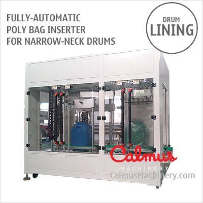 Poly bag inserter for placing liner in drum. This fully-automatic poly bag inserting machine is especially designed for placing liners in NARROW-NECK drums by one each. The bag inserting machine cuts and seals film as a bag from a roll stock, opens and cuffs the bag over a drum top, plungs the bag down into the drum bottom, blows air to extend the bag to fit the internal wall of drum better.