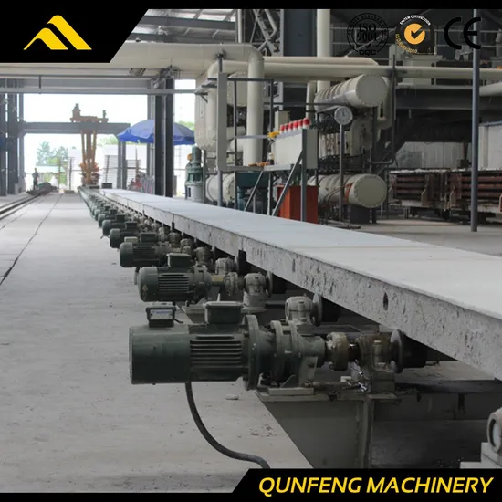 (17)Ferry Cart (18)Turning Crane (19)Vertical Cutting Machine (20)Horizontal Cutting Machine (21)Turning&Grouping Crane (22)Curing Cart (23)Autoclave (24)Finished Product Crane (25)Block Clamping Machine (26)Winch For Side Plate Return Technological process: 1. First, dose and match measured raw materials; 2. After distributing, feed raw material into pouring mixer to make slurry. 3. Through thoroughly mixing, the slurry is poured to mould; , 4. After pre-curing under a certain temperature and time, the block would reach a certain hardness and prepare for cutting; 5. Tilting hoister would turn over 90 degrees of mould; 6. Then open the mould and separate it from block. And take the block with side plate to the cutting cart; 7. Firstly, the cutting machine vertical cuts blocks from both sides. 8. Secondly the horizontal cutting; 9. Finally the vertical cutting; 10. After cutting, the block is hanged to trolley with side plate by semi-finished product hoister; 11. Organizing the cut blocks and put them into autoclaves; 12. Hardening the blocks under certain temperature and pressure; 13. Carry the finished product out of autoclave 14. The finished product hoister take the finished product to stock shield; 15. Packed for loading; 16. The side plate return back through side plate roller; 17. Side plate would be organized with open mould; . 18. Clean the mould and prepare for next pouring; 19. Steel bars processing line for slab production.