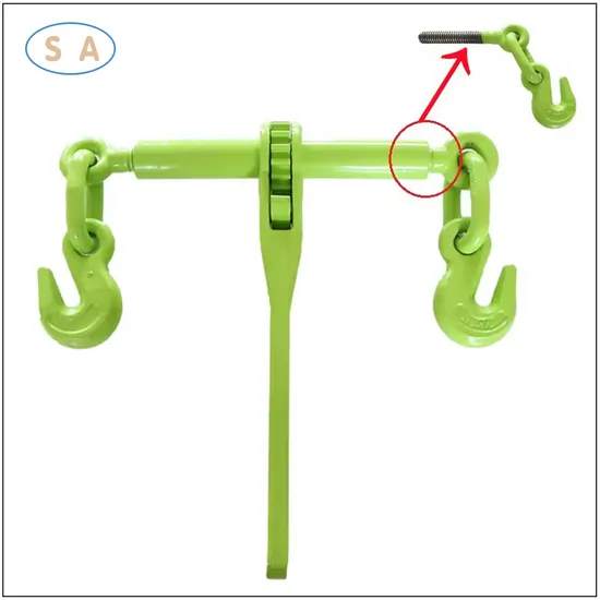 * Type: ratchet type.with hook and pin * Material: Alloy steel / Carbon steel. * Surface finish: Painted. * High quality load binder with drop Forged steel body * Alloy Grab hook is durable for lashing chain. * Hot-Treated ratchet is more robust. Heavy duty steel safety hooks. * Simple to assemble with chains without using any intermediate coupling links * Customized sizes are welcome * Any other types: EN12195-3 Ratchet load binder, lever type load binder, spring load binder,
