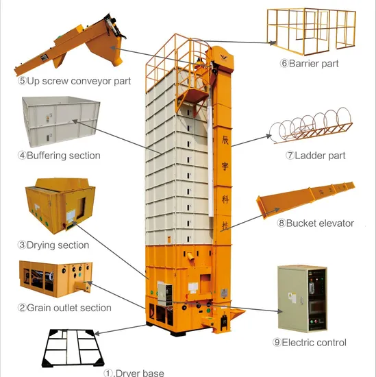 | Standard device | Online moisture meter, online temperature detector, dryer base, dryer discharging layer, drying layer, tempering layer, elevator, hot air blower, guard railing, ladders, etc. |
