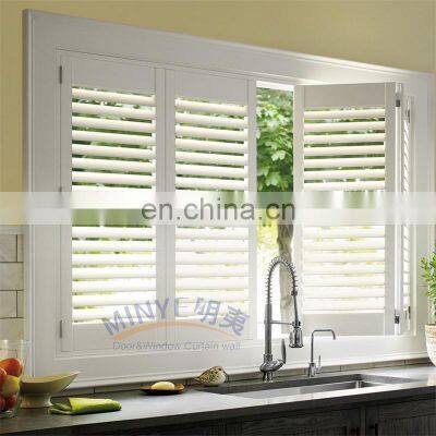ItemWhite Sunscreen Horizontal Louver Plantation ShuttersProfile1.6063-T5/T6 normal aluminum,thermal break aluminum2.pvc/upvc/VINYL(China top brand CONCH/German Brand REHAU/Korea brand LG)Glass1.Double tempered glazing:5mm+12A(Air)+5mm; 5mm+12A+5mm tinted; 5mm+12A+5mm Low-E; 5mm+27A+5mm 2.Single tempered glazing: 3/4/5/6/8/10/12/15/19/21mm3.Laminated glazing: 5mm+0.76+5mm, 5mm+0.38+5mmHardware1.German brand: Roto, Siegenia, Geze2.Chinese brand: Kinlong,HopoMesh1.Stainless steel security mesh2.Aluminium security mesh3.Fiberglass flyscreen4.Retractable flyscreenSurface treatment1.Powder coating2.Anodized3.Electrophoresis4.Wood grain5.Fluorine carbon coatingParametersDouble glass sliding windowsSounds insulation: RW ≥ 30 dBWind pressure resistance: 4500 paAir permeation resistance: 70/150Water resistance: 450mmN6 CLASS based on AS2047 STANDARDWarrantyTen years Q: Are you a Trading Company or a Factory? MINYE is 100% real factory and has been verified by SGS Group.Here is a VCR for your reference: https://shanghai-my.en.china.cn/company_profile/video_introdution.htmlQ: How about your production time? About have 25-30 working days.It depends on the windows&doors types and profile (like color requires).Q: What about your MOQ? For window and door, the minimum order quantity is 30 Square meters.Q: Do you accept customized design and size? Yes, sure, windows and doors are highly customized goods. So the size and design are up to you.Q: What’s your payment term?T/T, L/C, Trade assurance and PayPal are available.Q: What is your color available? MINYE Standard Colors have Black, White, Dark grey, Nature, and Coffee. Other RAL Colors are also available but it will spend more time and money. Q: What kinds of hardware mostly? China brand: HOPO, KIN LONG, PAGANI, YEAR, CHUANG Germany brand: ROTO, SIEGENIA Italy brand: SAVIO, GIESSEQ: What is profile available in your factory? Aluminum (Non-Thermal Break and Thermal Break), PVC(UPVC&VINYL), Aluminum Cladding wood.Q: Do you provide Sample? Sure, it is available. But we need charge for sample cost and freight fee.