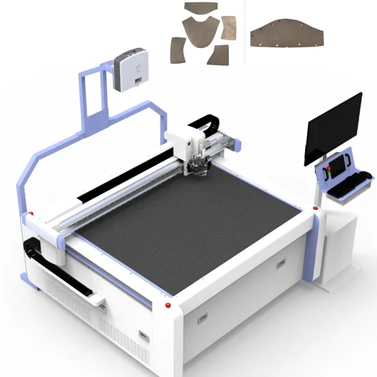 Our digital oscillating knife cutting machine is mainly used for all kind of shape cutting of non-metallic flexible materials. Using independently developed CAM cutting software and intelligent nesting and typesetting software, it is equipped with various tools such as vibrating knife, pneumatic knife, wheel knife, indentation knife, painting pen, milling knife, etc. It can quickly complete all kinds of processes such as full cutting, half cutting, engraving, punching, crease, marking, identifying contour cutting, and solve the problem of special-shaped drawing cutting. The machine is widely used in advertising, seals, leather shoes, composite materials, automotive interior, clothing, carpet floor mats and other industries. Different cutters are flexibly configured according to different cutting materials to achieve the characteristics of one machine with multiple uses.Whether you are cutting clothing fabrics, fur leather, carpets, PVC, corrugated paper, foam, advertising materials, carbon fiber, gaskets and other materials can easily meet your cutting needs! Die-less smart cnc shoe material leather cutting machine for shoe factory can have projector preview and positioning system.