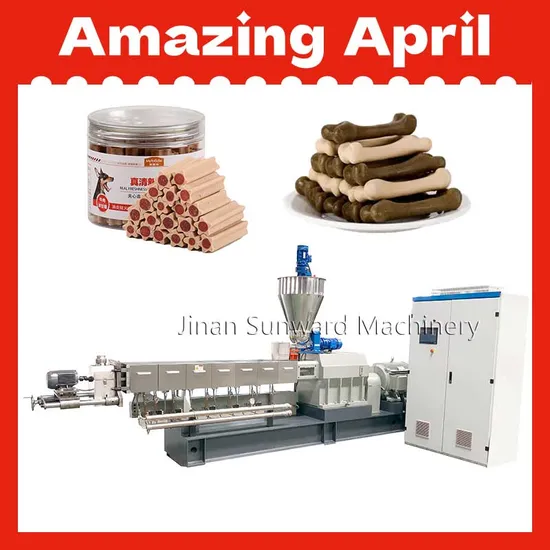 Pet chews take starch as raw materials with scientific configuration and was extruded from an extruder. It can be made into different kind of shapes such as sticks, bones,bi-flavor, etc. This kind of food not only provide protein, fat, vitamin, and nutrition for dogs but also satisfy the dog nature hobby. It has the following features: strong teeth, clean mouth, and teeth. The products can be in many shapes, like twists, double colors,cor-filling, and so on.