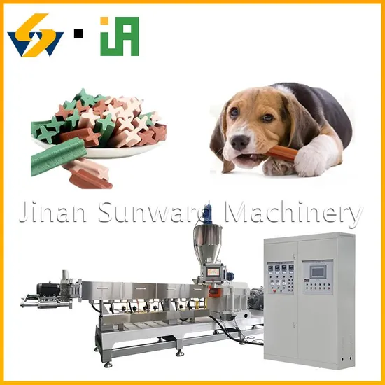 Pet chews take starch as raw materials with scientific configuration and was extruded from an extruder. It can be made into different kind of shapes such as sticks, bones,bi-flavor, etc. This kind of food not only provide protein, fat, vitamin, and nutrition for dogs but also satisfy the dog nature hobby. It has the following features: strong teeth, clean mouth, and teeth. The products can be in many shapes, like twists, double colors,cor-filling, and so on.
