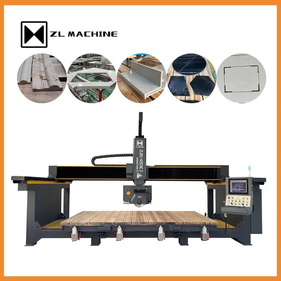 For processing marble, granite, porcelain, and quartz stone countertops, we provide CNC Bridge Saws of the ZLBS-425CNC/(5+1) A type. It is a precise, effective, and user-friendly machine. The operator begins processing after taking a picture of the plate and adding the drawing layout to the image. Saw blades, milling cutters, suction cups, and pressure plate cylinders will automatically generate combined processing steps according to the program. Before the milling cutter works, the program will automatically control the cylinders to press the plate. When the milling cutter is over, the cylinders will automatically drop, which is convenient for saw cutting.If the blade-cutting path conflicts, the suction cup can help.Additionally, conventional cross and straight slices of plates, various polygons, circles, ovals, and maws, as well as L-shaped countertops and four-sided under-hung countertops, are all cut and chamfer using the CNC Bridge Saw. The basin, faucet, and inner angles are all processed by the miller. Therefore, the machine is used to help install countertops without any dust. We also provide OEM/ODM production machine service; if you require anything, feel free to contact us.
