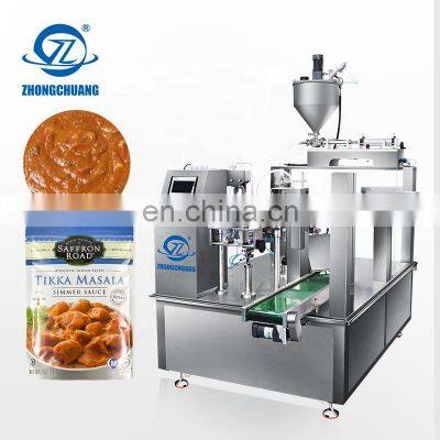 Rotary Stand Up Retort Food Pouch Filling Viscous Cooking Curry Hot Masala Simmer Sauce Liquid Doypack Packing Machine