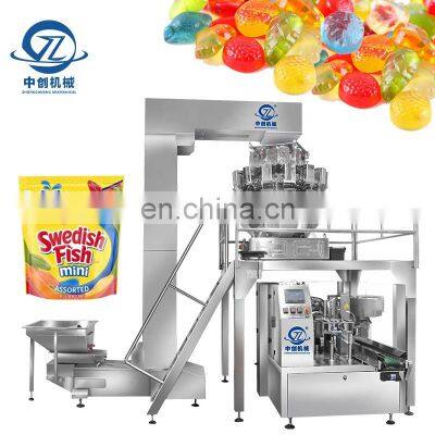 ODM Multihead Weigher Packaging Machines Automatic Sweet Gummy Bears Candy Zipper Pouch Doypack Packing MachineProduct ParamentersItem NO.ZC-D200/250DimensionsL5258mm×W3610mm×H3655mmPacking Speed16-60 Bags/min (depending on products character and filling volume)Packing Bag SizeL: 100-350mmW : 60-200mm/80-250mmWeight1800KGAir Compressed air consemed≤0.6m³ / minAccuracy±1g (≤100g) / ± 1%( >100g) according to materialApplicationSuitable for Frozen French fries,candy melon seeds,jelly,frozen dumpling,pistachio,nuts,peanuts,almonds,raisins,chocolate,etc.Working Procedure1.Bag feeding2.Coding3.Opening4.Filling A5.Filling B6.Heat sealing A7.Heat sealing B8.Forming and outputDescription1.According to customer demand for customized, to recommend the appropriate products to customers.2.Storage racks devices which can Satisfy the products short stop ,which can keep the production line work continuously.3.Good service,If you have any questions, you can communicate by telephone video.Recommend ProductsProducts DescriptionCompany ProfileFAQTrade patterns 1. Lead time: 15-20 working days after receive deposit2. MOQ: 1 set.3.30% deposit+ balance payment before delivery by T/T, western union, cash.4. Loading Port: Shantou or Shenzhen Port Export Process 1. We will prepare goods after receive deposit 2. We will send goods to your warehouse or shipping company in China.3. We will give you tracking number or Bill of loading when your goods is on the way 4. Finally your goods will arrive your address or shipping port Frequently Asked Questions Q: First time import, how can I believe that you would send products? A: We are verified company by Alibaba to make transaction success, we support and recommend you to pay money to us by Alibaba Trade Assurance.Q: How about the quality of your product?A: Our products manufactured strictly according to national and international standard-- We have ISO certification-- We take a test on every product before delivery.Q: How to choose the machine type for our bags? A: Pls support us the following information about the bag and the food. 1) Bag pattern (Bag samples or pictures would be appreciated.)2) Bag size 3) The filling weight or volume 4) Material of food: powder/liquid/paste/granular/massiveness Q: What aftersales service or any question about products?A: This machine enjoys 1 year warranty