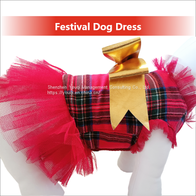 Christmas Dog Clothes/ Dog Christmas Hat/ Bow Plaid Skirt Dog Dresses/ Golden Bow Dog Skirt/