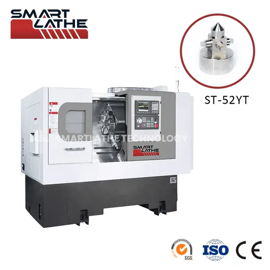 ST-52YT is equipped with a CNC program-controlled hydraulic tailstock, a 12-station power turret, a power milling head that can be installed at the upper or bottom position of the Y-axis (turret), high rigidity cutting, suitable for long-axis turning, milling, Processing of complex multi-process products such as drilling and tapping.