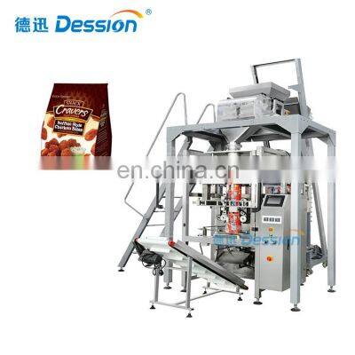 Automatic big doypack packing machine packing machine for doypack pouch granule foodProducts DescriptionDession automatic weighing packing machine is suitable for packaging of bulk materials with high precision and fragility, such as: puffed food, jelly, candy, nuts, potato chips, small hardware, medicinal materials, etc.According to customer needs,can offer different bag styles.such as pillow bag,back sealed bag with hole,gusseted bag and gusseted bag with hole hanging.1. The section where the material contact is stainless steel as the body of machine is optional for complete or partial stainless steel and all out equipments have passed the CE Standard. 2. Optional English or Chinese screen display, easy and simple operation. 3.High-sensitivity photoelectric color tracing and digital input of cutting position get more accuracy.4. Packaging speed and length of bags can be set to some extent without further adjustment and parts changing. Packaging speed and length of bags can be set to some extent without further adjustment and parts changing. 5. Bag-making, filling, sealing,cutting, counting, thermal pressing of batch number can be achieved automatically and straightly. 6. Flat cutting, pattern cutting, linking cutting can be realized by changing the tools;easy operation with smooth bags. 7. Bag-making equipment can be changed according to specific requirement of customers and products.Machine HostModelDS-520LMeasuring Range150~2000 mlPackaging Speed10~50 bags/minBag SizeL:80~350 mmW:80~250 mmFilm Roll WidthMax.520 mmPower Requirements220V,50/60 HZ,3KWMachine Dimension(mm)(L)1488*(W)1080*(H)149010 Heads Electronic ScalesMax.Cap.(g) 10~1000 gWeighing Accuracy(g)±0.5~2 gMax. Weighing Speed65 PPMHopper Volume1600 mlPower Requirements200V,50/60HZ,1KWMachine Dimension(mm)(L)1620*(W)1100*(H)1100Machine Weight420KGZ Type Material ElevatorMachine Height3 mWorking Speed0~17 m/minCapacity3~6 m3/hourPower Requirements220V/380V,0.75KWSupporting PlatformMachine Dimension(mm)(L)2900*(W)1000*(H)10004 Head Electronic Scale14 Head Electronic ScaleIf you want to know more about the machine, please contact me!!!联系方式Our CompanyCertificationsPacking & DeliveryPayment1.T/T and Western Union are accepted2.30% deposit before production and 70% balance before shipment3.All banking charges outside China are on buyersShipping1.Upon receipt of payment , delivery date will be in 15-30 working days,2.By Air, by Sea or by Express (DHL etc)3.Shipment cost will depend on the destination, shipment way and the weight of the goodsFAQQ1:Do you have manual or operation video for us to know more about the machine? Yes, not only manual or operation video, 3D drawing also available to make as per your design,also the video we can make of testing the material from our packaging machine if your packing goods easier for us to find from our local market. Q2:How can I trust you for the first time business ?Please note our above business license and certificate. And if you don't trust us, then we can use Alibaba trade assurance service, guarantee your money, and guarantee your machine's on-time delivery and machine quality.Q3:Is engineer available to serve oversea?Yes, but the travel fee is paid by you. So actually to save your cost, we will send you a video of full details machine installation and assist you till the end.Q4:How can we make sure about the machine quality after we put the order?Before delivery, we will send you the pictures and videos for you to check the quality, and also you can arrange for quality checking by yourself or by your contacts in China.Q5:Will you provides the door to door service?Yes. Please offer us your final destination, we will check with our agent to see if it available, and most of the area is ok for us to clearing and sending in your countries.Why Choose Us