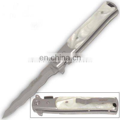 9 Inch resin handle with stainless steel blade folding pocket Style knife specification: * Different handle colors are available, such as: Blue, Red, Black, Green,Orange, etc.* You can also choose 440 or other stainless steel to make the knife blade* The knife blade can be black coated, titanium coated, bead blast finish or satin finish.* We can use other materials to make the knife handle as you request, such as G10,Micarta, Resin, Aluminum, Stainless steel, Wood, Plastic, Animal Horn or Animal Bone, etc. Quality description: Locking MechanismLinerlock folding knifeHandle length125mmHandle materialCamo coated stainless steelBlade length100mmBlade finishSilver coatedBlade material175 or 440 stainess steelweight142GComes withPocket clipRemarksDifferent handle color is available Photo Show: Company Introduce: Yangjiang Homeful Industry & Trade Co., Ltd. was founded in 1998. Our company is manufacturer and sale of all kinds of outdoor knife, camping knife, hunting knife,pocket knife,knife set ,dive knife,survial knife,combat knife,sporting knife,rescue knife,canoe knife,toothpick knife,hunting knife,outdoor knife, fixed blade knife, swiss knife ,utility knife,multi tool,multi tool pliers ,axe,multi hammer ect.Our strengths: competitive price + stable quality + flexible service + quick supply ability+ OEM available Payment team: 1.MOQ: 1000PCS 2.Lead time: about 35 days after order confirmed. Payment terms: 30% deposit, remain 70% against fax copy of Bill of Lading and other shipping documents. 3.Sample time: 3 days without logo, 5 days with logo. warning the knives in this tool are extremely sharp,and should be used with the utmost care and caution Contact us: *If you have any question about our products or your shipping status of your order,please feel free to contact us. *We will answer your message within 24 hours. Website: Add.:Yuyuan 5 Road,Yitong Industrail Zone,Yagnjiang ,Guangdong,China. Welcome to visit our company!!