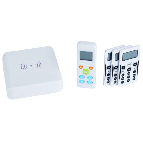 The keypads are powered by standard CR2032 round cells, cheap to buy and easy to find at other retailers as well as being available direct from us. The teacher-end controller is equipped with 2 AAA batteries.