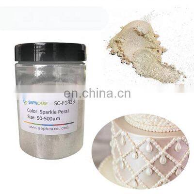 Product DescriptionSephcare cake decorating additive metallic luster dust edible pigment food coloringSephcare's food grade pearl pigment is make up of natural mica flakes, titanium dioxide and iron oxide. The pearlescent pigments are specially made to meet the food and pharmaceutical industries' high quality requirements. all kinds of luster is coated with iron oxides, and the iron oxide can increase the color absorption rate. And this is how we keep our gold luster so shinny.In order to obtain all kinds of luster effects, what we did, is to maintain a certain amount of thickness of the iron oxides.Item NameEdible metallic food additiveColor Multi colorAppearanceFine powderPH6-11Density2.50-3.40 kg/LParticle size10-60 µmSolubility (in water)InsolubleApplicationFood pigments, leather pigments, coating pigments, cosmetic pigment, ink pigments etc.PaymentTT/Weatern Union/PayPalShippingFedex, By Air, By Sea.Detailed ImagesOur CompanyOur ServiceTo support all the demanding customers, we are going to focus on value addition in order to satisfy the needs of all our customers. The valued-added service spans:1.Special Packings 2.Own Brand Labeled 3.Product Images Support 4.Formulation Guideline Support,etcPacking & DeliveryAll freights are determined based on the weight of the item and the destination. 1.1kg with double plastic container inside/Aluminum foil bag outside. 25kg with double plastic container inside/Fiber drum outside or it is at your option.2.Dispatch goods Usually via DHL and FEDEX, but other kind of shipping ways can be negotiated.3.Delivery Time: 7 days after payment.FAQQ1: How can I place order?A: You can send inquiry to us or start a chat online with me first.Q2: Do you provide samples?A: Yes. Sample pack can be send to you, please tell us your usages, also need your shipping address and post code.Q3:How can I pay for you?A: We accept Online bank payment,T/T and Western Union and Trade Assurance. Before you pay, please contact us for payment details.Q4: Can you do OEM for me?A: Yes, we are good at OEM order, just provide us what you want and we can give the best design.
