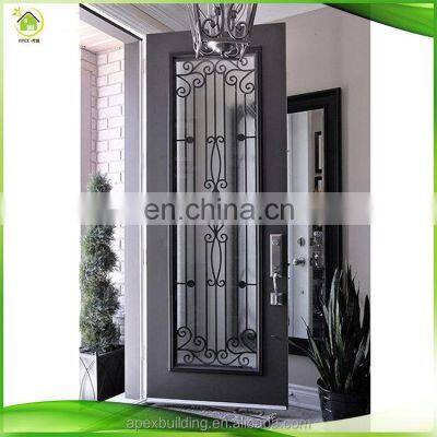 ItemWrought iron entrance door exterior door with sidelightMaterialForge ironStyleDouble/eyebrowSize6*8ft/customizedOpeningSwing in or swing out both are okAnti-rust treatmentsand blast, hot zinc spray, epoxy primer(twice), acrylic acid black paint, hand applied faux finish, varnish coatThresholdIntergrated threshold with door jamb to ensure the strongness of the iron doorWeather strippingRubber weather stripping seals around jamb, door panel and glass panelPolyurethane foamJamb, panel, threshold and kickplate are fully injected with polyurethane foam