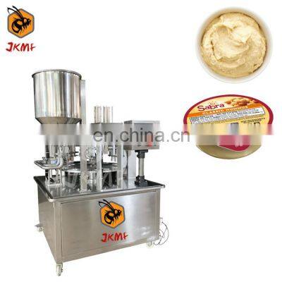 In Stock Factory Price Hummus Cup Filling Machine Mashed Potatoes Cup Filling Sealing MachineProducts DescriptionApplicationThe rotary cup machine is fully automatic to container-loading, fill, foil-loading, seal and overlid stackable containers with reliability and accuracy. This cup filling sealing machine is equipped with PLC and touchscreen HMI, gives flexiblity to configure properly for your application. All control functions are adjustable via the menu-driven operator interface. Precision made and built to last, our cup filling and sealing machine combines innvoative features, customized for a perfect fit every time.The mold of this machine can be customized according to product requirements.The machine can be customized for filling sealing packing ice cream, yogurt, milk, soymilk, chilli sauce,juice, honey, ketchup, mineral water etc.Machine InformationHoney spoon filling machineModelJK-250HSJK-320HSPacking speed800~1000 pieces/hour1600~2000 Pieces/hourFilling volume1~20gMachine power220V/380V,50HZ,4KW220V, 50HZMachine size(L*W*H)1217*1015*13431250*1250*1650Machine weight250KG280KGMain Features1. Digital screen display with numerical setting and flexible operation.2. Imported PLC control system and color touching screen, easy operation.3. Imported film driving system and color sensor enable accurate position.4. PID independent control of temperature, more suitable for different packaging material.5. Multiple automatic alarming functions, maximum deduction the loss.6. Dual encoders enable more stable performance.Machine Working ProcessTouch Control ScreenSet the parameters on the screen, such as filling weight, speed, etc.Falling Cup DeviceSpoon drop down one by one automatically.Metering Filling DeviceAutomatically measure the required weight and fill it into the cup.Foil Film Lid StationVacuum arm suck and put foils on cups for cup sealing.Heating sealing deviceAutomatic high temperature sealing, good sealing performance.Automatic Delivery of Finished ProductsGet perfect finished cup.Why Choose UsJIKE BEE MACHINERY has a professional team to provide customers with various packaging solutions. Fully understanding the needs of customers,engineers design the most suitable solution. We have our own processing and assembly workshop and quality inspection and debugging process to ensure the quality of the machine. After acceptance by the customer, they are packed in international standard wooden cases and shipped.Company ProfileFoshan Jike Bee Automation Equipment Co., Ltd. is a manufacturer of automatic packaging equipment.We are a production-oriented enterprises focused on product innovation, factory direct sales and perfect after-sales service in one.The automatic packaging equipment for granule, powder, liquid and sauce produced by the Jason company is at the advanced level of the industry,it can be customized production automatic material packaging line for all kinds of products .Mainly applicable to: food, hardware, drugs, daily chemicals, pesticides, fruits and vegetables, cosmetics, other industries.The company has its own patent and product technical certification, which can bring customers high quality equipment and worthy of customer trust.Customer PhotosOur customers have covered more than 80 countries around the world.And give us unanimous praise.CertificationsFAQQ1:Do you have manual or operation video for us to know more about the machine? Yes, not only manual or operation video, 3D drawing also available to make as per your design,also the video we can make of testing the material from our packaging machine if your packing goods easier for us to find from our local market. Q2:How can I trust you for the first time business ?Please note our above business license and certificate. And if you don't trust us, then we can use Alibaba trade assurance service, guarantee your money, and guarantee your machine's on-time delivery and machine quality.Q3:Is engineer available to serve oversea?Yes, but the travel fee is paid by you. So actually to save your cost, we will send you a video of full details machine installation and assist you till the end.Q4:How can we make sure about the machine quality after we put the order?Before delivery, we will send you the pictures and videos for you to check the quality, and also you can arrange for quality checking by yourself or by your contacts in China.Q5:Will you provides the door to door service?Yes. Please offer us your final destination, we will check with our agent to see if it available, and most of the area is ok for us to clearing and sending in your countries.
