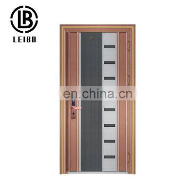 Product SpecificationProduct nameStainless steel security doors entranceStandard Size2050*900/1200/1500/1800mm or can be customizedOpen directioninward or outward, left or rightStainless steel sheet thickness1.0MM/1.1MM/1.2MM/ can be customizedAccessorieshandle, hinges, installing boltsMaterialstainless steelLockmain lock + up-down lockSurface treatmentstainless steel, marble color can be chooseTypeExterior doorOpening styleswingDelivery time30-35daysCompany InformationAbout UsFoshan Leibo in 1998 and developed trade business in 2005, Foshan Leibo Cunstrction Material Factory has experience inmanufacturer and exporter more than 12 years. We are specialized in the development and production of aluminium doors&windows,aluminum balcony&handrails, steel door , stainless steel door , iron sheet etc.All of our products comply with internationalquality standards and are greatly appreciated in different markets throughout the world.Our CustomerProduct CertificationProject CooperationPackingFAQQ:What is your main production ?A: We are major in making the security doors products.Such as Bulletproof Doors,Copper Doors,Security Steel Doors,etc.Q: Is your company the factory or trading company ?A: We do have our own production line of quality security doors, at the same time,with more than 10 years experience of exporting doors to all over the world, wecombine difference cooperated factories as an union to provide one-stop purchaseservice of all kinds of doors.Q: How is your packing ? A: We use different methods of packing depends on different doors and our customers'demand, and we also accept OEM of customers' brands. Usually for most of the productswe use 5- layers carton package. Q:How is your company products quality ?A:Our company products all produced in factory,by three times QC check.During produce,after produce and before pacakge .Just believe in us.We will do good quality products for you .