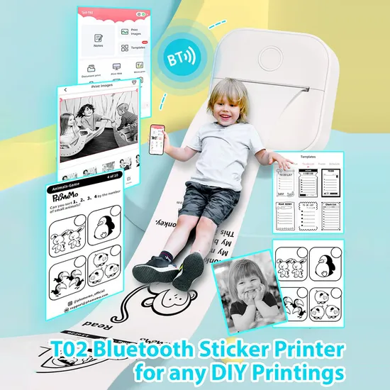 PHOMEMO T02 Mini Thermal Printer Bluetooth Home Label Printing Device - White Mini Size: You can easily put it in your pocket or a bag, convenient to carry on and use it anytime, anywhere Thermal Inkless Printing: Convenient to quickly printing different black and white images. No need for ink cartridges or consumables Color The Photo: Children can paint the photos with their colored pens to stimulate their imagination and creativity Wide Application: It can be used to print QR codes, scrapbooks, journals, storage labels, lists, memos, photos, etc Nice Gift: It's also a practical gift for kids, students, families and friends Specification: