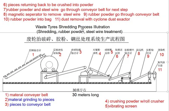 Waste Tyre Cutting in Pieces--- Continuous Feeding---Reactor Double Heating Pyrolysis--- Heat Evaporation (with chemical)---Continuous Pyrolysis (with catalytic)---Continuous Heat Transfer---Crude Oil Finished Product---Non-condensed Gas Treatment---Smog Flue Purity.