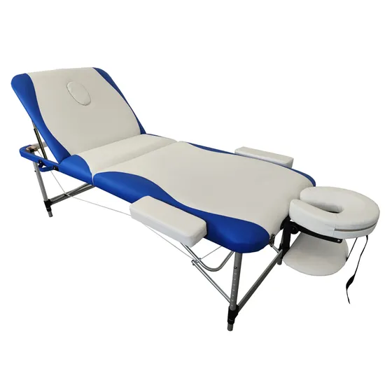 The structure is made of high quality lightweight aluminium alloy. Other accessories are located under the bed: adjustable headrest support, headrest cushion, front suspension arm support and arm supports on both sides. There are also elastic straps under the bed to hold the accessories in place for easier portability when folding the table. The legs of the massage bed are connected by electrical cords, giving them a high degree of stability. The height can be adjusted via buttons on each leg. The massage bed is CE certified and is made of high quality PVC leather and is available in different colours.
