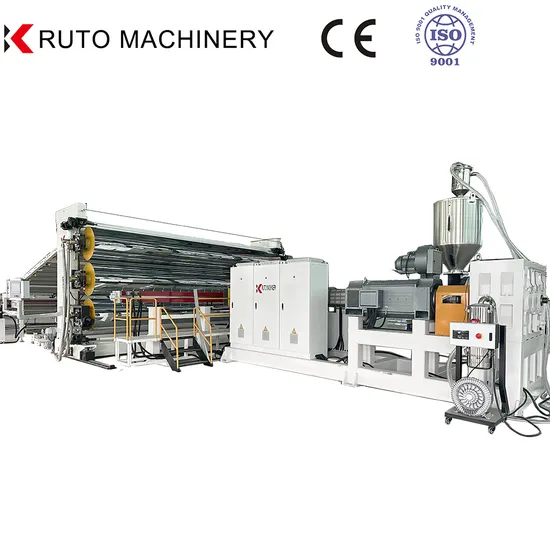 The lines are equipped with one or more (depending on the number of layers) extruders, an automatic filter change system, a flat die of a special design (single-layer or co-extrusion), a calender section, a cooling conveyor with an edge trimmer, a pulling device, a cross-cutting device, a winder ( for thin sheets) or hydraulic storage table.