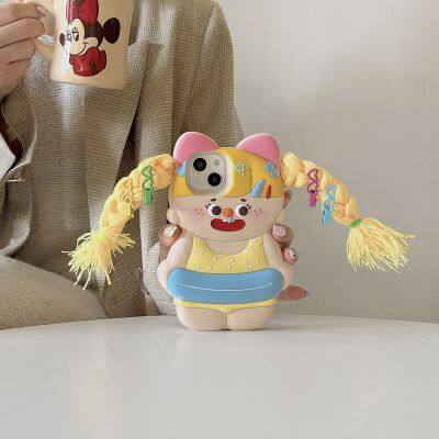 Cartoon cute double braid swim Ring girl shock-proof silicone phone case 12 13 14 15 Pro Max