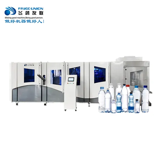 Faygo union 2024 newly released Automatic Linear Plastic Bottle Blowing Filling Capping 3 in 1 Machine monoblock for Small Drinking water Production Plant Bottling Beverage juice oil liquid -- the best choice for small-scale bottled mineral water beverage plant. Small integrated equipment, small footprint. Max 24000 bottle per hour.