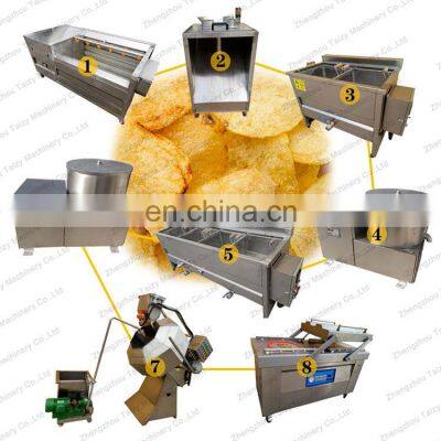 Small Scale Potato Chips Production Line French Fries Potato Chips Machine1. We produce capacity of 60-70kg/h and 150kg/h of finished products2. The production line is made of 304 stainless steel3. The whole line just need 1 person to operate 4. Motor of the whole line is fully enclosed,so it has no voice pollution to people Fried Potato Chips Production Line Working Process:30-50kg/h Semi-automatic Potato Chips Production Line:No.Equipments PowerDimensions1Potato Washing&Peeling Machine0.75kw/220v/50hz690*430*860mm2Potato Chips Cutting Machine0.75kw/220v/50hz650*510*700mm3Potato Chips Blanching Machine15kw/380v/50hz1310*650*700mm4Potato Chips De-watering Machine0.75kw/380v/50hz940*560*830mm5Potato Chips Frying Machine21kw/380v/50hz1380*620*950mm6Fried Chips De-oiling Machine0.75kw/380v/50hz940*560*830mm7Fried Chips Seasoning Machine0.75kw/380v/50hz1000*800*1380mm8Fried Chips Packing Machine1kw/380v/50hz540*520*920mm Process for French Fries Potato Chips Production Line: FAQQ: What capacity does the french fries production line have?A: Our factory offers fully automatic and semi-automatic production lines for large, medium and small factories.Q: How much is the water temperature when blanching potato chips?A: Blanching temperature is 80 ° C, blanching time is about 1-2 minutes.Q: How many degrees does the oil temperature set when frying French fries?A: Frying time is about 5-6min, frying temperature is 160-180°C.Q: How do I know about the details and quality of your machine?A: First, we have product brochures covering all details including parameter, material, output, etc. of most of our production lines; secondly, we can provide you with videos filmed on-site with details about the working process and how mechanical parts work during operation; at last, you are warmly welcomed for on-site inspection at our factories. Q: What certification do you have?A: We have CE, BV, SGS, ISO, CCC, etc. Please do trust us, we are determined to provide you the best quality equipment.Feedback Our Services1. MOQ (Minimum Order Quantity) One set is welcome, and mix products for order are welcome. 2. Delivery TimeDepending on your quantity, for goods we have in stock. Delivery takes few days to comply with your request to replace the plug or other configurations. For regular order, by ocean shipping takes 20-40 days. For small machines, express delivery for 3-8 days. 3. DeviationThere might be sightly difference in color, because of the computer monitor settings .With the difference in the measurement method, please allow 1-3cm in size deviation. 4. PackageStandard export wooden case or other packages depending on products packaging weight is subject to the actual pack. 5. Service Welcome your compliments and suggestions. Any inquiries or complaints will be respond within 24 hours.Factory Buyers Feedback Contact Us