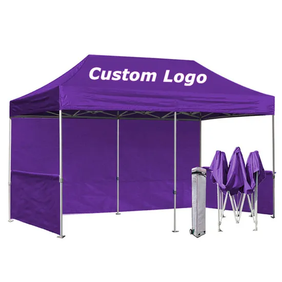 Custom Logo Printed Outdoor Advertising Floding Aluminum alloy tent * 10x10 shade canopy provides 100 square feet of shade and 99% UV protection * Full Truss system for maximum frame strength *Aluminum frame is resistant to salt air & water corrosion * Each of the 4 sandbags can hold approximately 44 lbs each. The 8 stakes and 4 ropes will also help keep this patio canopy stable and sturdy. The carry bag is on wheels to make transporting the pop up canopy much easier.