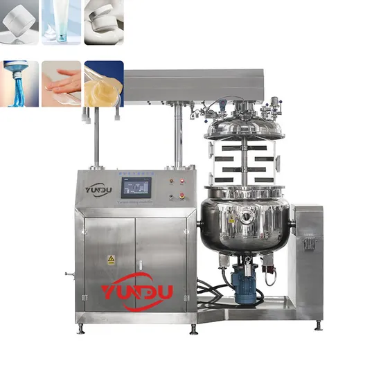 CBZRJ vacuum emulsifying machine is a new type of vacuum emulsifying equipment which integrates the functions of homogenization, emulsifying, mixing, dispersing, pumping, heating and cooling. Mainly applicable to cosmetics, food, chemical, pharmaceutical and other industries. For paste, cream (or colloidal) materials with viscosity below 50,000cp, homogenization, emulsification and stirring are carried out under vacuum. Make it obtain high quality products, the equipment design, manufacturing fully comply with GMP national standards.The equipment is composed of 1.emulsion stirring pot, 2. oil and water pot, 3. vacuum system, 4. heating and cooling system, 5. hydraulic lifting system, 6. dumping device, 7. discharge system, 8. feeding system, 9. electrical control system, 10. temperature control system, 11 working platform, etc.