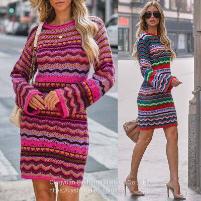 Women's Hollow-out Long Sleeve Sweater Dress High Neck Slim Fit Rainbow Knitted Midi Dress