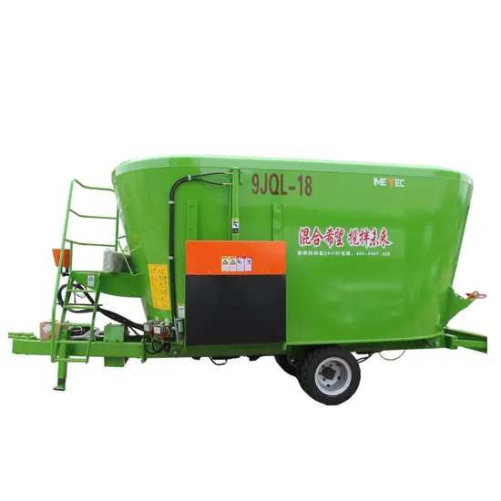 The 9JQL series fully mixed ration mixer is a vertical traction equipment. The feed mixing method adopts the form of a spiral agitator. Blades are installed on the blades to chop various hays, with low noise and less pollution. A discharge device is provided on the side of the box body. The discharge door is closed when the fixed mixer is mixing. After the feed is mixed, the discharge door is opened for unloading. There is a feeding device (customizable) on the rear side of the fixed mixer, which is controlled by a hydraulic system.