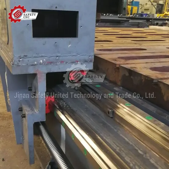 5. The mobile gantry adopts a cast structure and a guide rail with a different surface structure. It undergoes two rounds of heat treatment to remove stress. The two left and right legs of the gantry are installed on the column slides of the two beds. The two sets of high inertia AC servo motors on the left and right beds synchronously drive two precision ball screw pairs to drive the CNC sliding table and gantry to move longitudinally (X1 axis and X2 axis). Two sets of linear guide rails on the left and right beds ensure high positioning accuracy and repeated positioning accuracy.