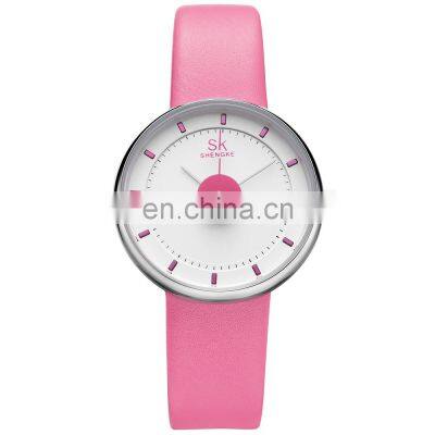 SHENGKE Lovely Lady Watch Unique Design Custom Logo Soft Leather Watch Japan Quartz Movt. Blue Pink Black Green Color Watches FAQ 1.What is your MOQ (MOQ=Minimum Order Quantity)?If you order our brands (SINOBI / SK) watches which we have in stock, no MOQ limited, you can buy how many you want, and can mix with different models and different colors.For OEM or ODM order with brand your logo, the MOQ depends on the case material: ally case watches MOQ is 300pcs , stainless steel case watches MOQ is 500pcs 2.Can you provide sample first before I place mass production order?Yes, we can provide samples for your reference, and the sample fee will be returned to you when you order mess bulk products which reaches minimum order quantity 300~500 pieces3.How about your products quality?Our quality had praised so many clients , quality advantage as below :1)All our SINOBI and Shengke (SK) watches are at least 3ATM water resistant, 100% tested by Waterproof Testing Machine.2)All our brands’ watches are vacuum plated,color would last at least 1~2 years.3)For OEM or ODM watches, we will produce the watches as your requirements. It can comply with CE&RoHS, etc. You can arrange your QC team or hire the third party to test the watches before delivery.4.How long is your warranty time?All our Sinobi and Shengke (SK ) brands watches’ is 12 months warranty. 5.What's the delivery time?If take our brand logo watches, the delivery 3~7 days after paymentFor OEM orders, the delivery time is : alloy case watches 20~25 days , stainless steel case watches 45~50 days .6.How about shipping methods?If you have a courier in China, goods can be sent to your courier after payment.If you have no cooperated courier, we will check the shipping details and cost for you after your final order is confirmed.7.Are you factory or trade company?We are factory (in Guangzhou ,China),welcome to visit our factory, if you are interested in our factory ,please contact us for more details.8.How to place an order?Click below picture to contact with us for more information