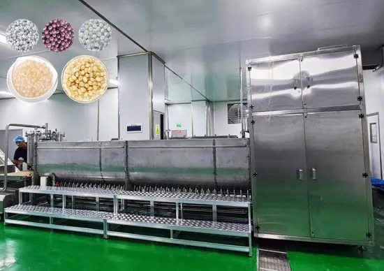 The popping bead/popping boba/crispy wave/crystal ball/milk tea pearl production line was developed by Changzhou Jinma Packaging Co., Ltd. This equipment is the main forming equipment for the popping beads of milk tea drinks. The materials coming in from the preforming equipment are continuously processed in this equipment. The reaction eventually forms the finished pop-up beads.