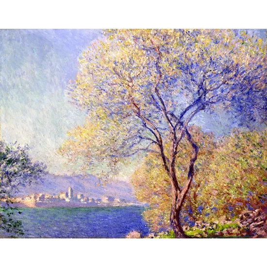 This painting is a work by Claude Monet, showcasing the typical Impressionist style. In the picture, a tree with lush branches and leaves stands in the foreground. The leaves, a blend of golden and light green, look vibrant under the play of light and shadow. Monet used delicate and short brushstrokes, with colors intermingling, blurring the specific outlines of objects. The town in the distance looms faintly in hazy tones, creating a spatial extension with the tree in the foreground and the lake below. By capturing the changes in light, color, and atmosphere, Monet vividly presents the instantaneous impression of the natural landscape at a particular moment, creating a serene and poetic atmosphere. Detailed Photos Product Parameters