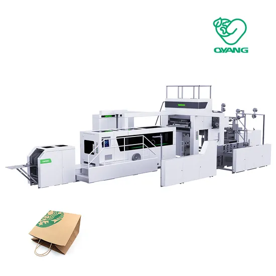 Product Feature Oyang 16- A330 full automatic square bottom paper bag machine is used for the production of a paper bag with a twisted and flat handle loop. Transmission of the handle made by handle making unit, cut, stick, pressed, and then pre-cut, glue, auto handle stick in empty or printed roll paper. Then the main machine will glue the paper with the handle loop to the edge, paper bag tube forming, cut off, indentation, bottom glue, bottom forming, and sealing, bag conveying. the whole process is completed simultaneously at one time. Real realization of full automation production, can effectively save labor costs.