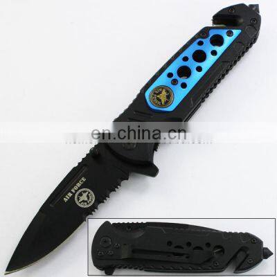 8" Hot Seller Stainless Steel Half Serrated Blade with Aluminum Handle Folding Military Pocket Knife specification: * Different handle colors are available, such as: Blue, Red, Black, Green,Orange, etc.* You can also choose 440 or other stainless steel to make the knife blade* The knife blade can be black coated, titanium coated, bead blast finish or satin finish.* We can use other materials to make the knife handle as you request, such as G10,Micarta, Aluminum, Stainless steel, Wood, Plastic, Animal Horn or Animal Bone, etc. description: Locking MechanismLinerlock folding knifeHandle length123mmHandle materialCamo coated AluminumBlade length82mmBlade finishSilver coatedBlade material420 or 440 stainess steelweight133.9GComes withPocket clipRemarksDifferent handle color is available Photo Show: Company Introduce: Yangjiang Homeful Industry & Trade Co., Ltd. was founded in 1998. Our company is manufacturer and sale of all kinds of outdoor knife, camping knife, hunting knife,pocket knife,knife set ,dive knife,survial knife,combat knife,sporting knife,rescue knife,canoe knife,toothpick knife,hunting knife,outdoor knife, fixed blade knife, swiss knife ,utility knife,multi tool,multi tool pliers ,axe,multi hammer ect.Our strengths: competitive price + stable quality + flexible service + quick supply ability+ OEM available Payment team: 1.MOQ: 1000PCS 2.Lead time: about 35 days after order confirmed. Payment terms: 30% deposit, remain 70% against fax copy of Bill of Lading and other shipping documents. 3.Sample time: 3 days without logo, 5 days with logo. warning the knives in this tool are extremely sharp,and should be used with the utmost care and caution Contact us: *If you have any question about our products or your shipping status of your order,please feel free to contact us. *We will answer your message within 24 hours. Website: Add.:Yuyuan 5 Road,Yitong Industrail Zone,Yagnjiang ,Guangdong,China. Welcome to visit our company!!