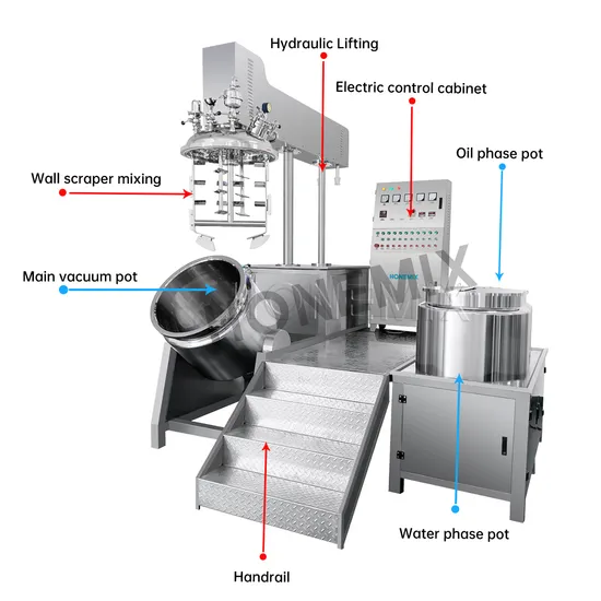 Vacuum emulsifying mixer machine consist of Water and Oil pot, Main emulsifying tank, Vacuum system, Tilting discharge system, Hydraulic lifting system(OPTION), Mixing system, Homogenizer system and Heating/Cooling system. All those functions work together to produce batches of good cosmetics products.