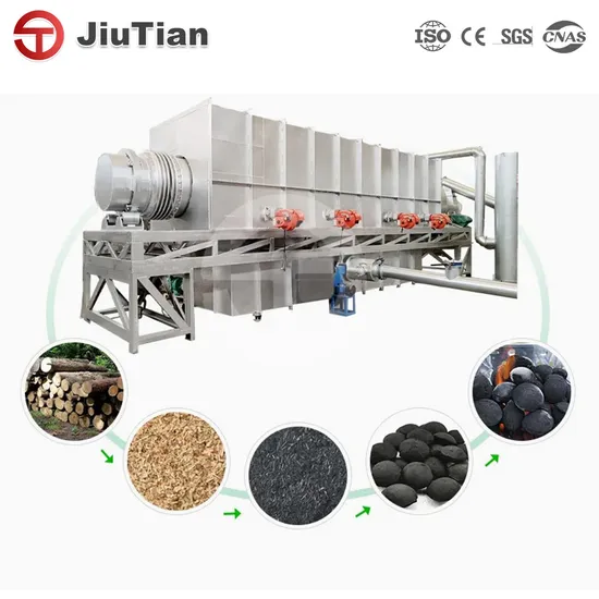 Jiutian Machinery products include continuous charcoal making machine, horizontal carbonization furnace, vertical carbonization stove, activated carbon plant, briquette machine, drying machine, etc.