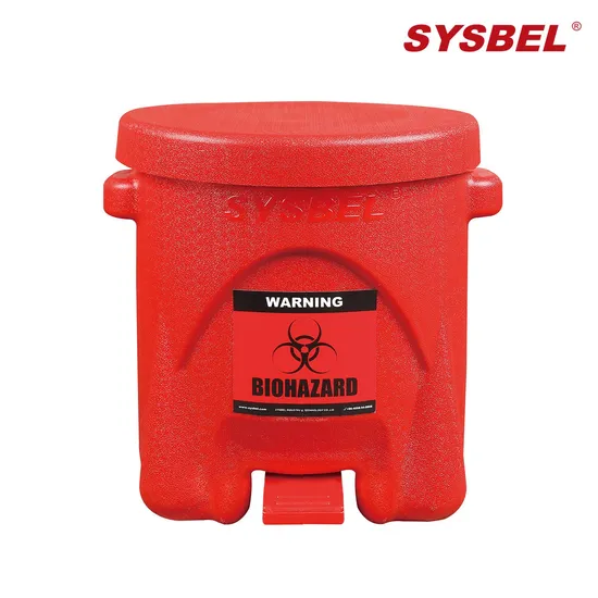 SYSBEL Biohazard Waste Can Thank you for using our products. As a company of caring employee safety and environmental protection, SYSBEL provides high quality products to ensure the safety of your working environment and personnel. 1.Constructed of polyethylene (PE), which are resistant to most chemical compounds. 2.One-piece, blow-molded construction has no seams to develop leaks. 3.Self-closing lid stays closed when not in use. 4.Convex lugs moves easily from workstation to workstation. 5. Foot lever opens lid to 60 degrees(max.) for hands-free access. 6. Labeled for easy identification. 7. Comply with OSHA 29 CFR 1910.125 and UL. 8. Used to store most hazardous solid waste. 9. With or without hazmat bags is permitted. 10.Some of the chemicals that are not compatible with polyethylene are strictly forbidden, please refer to their Material Safety Data Sheet (MSDS). 11.Grasp the lugs with both hands and keep level for carrying. 12.Recommended to choose SYSBEL oily waste can for combustible waste storage. 13.Loading on lid is prohibited;