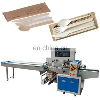 Fully automatic disposable plastic cutlery set with napkin packing machine for wooden spoon cutlery packing machineProducts DescriptionThe JK-B model flow packing machine features quick, easy changeover and adjustment that minimizes product and film waste and reduces maintenance costs. The machine working starts with a cylindrical roll of film. The flow wrapping machine will transfer the film from the roll and through to the forming collar (sometimes referred to as tube or plow). At the same time, a conveyor has lined up individual products for wrapping. The film is fed through the collar and the product is surrounded with film, sealed and the film is then cut. The finished individual product is then gathered downstream to be bagged or cartoned prior to boxing and palletizing.Automatic flow packing machine is a widely used packing machine. Suitable for all kinds of product packaging. Including medical supplies, vegetables and meat, baked bread, snacks and candy, daily necessities, hardware accessories, etc.Machine ParamentersMain Features1.Dual frequency conversion control, Bag length can be set and cut in one step, saving time and film.2.Interface features easy and quick setting and operation.3.Self failure diagnosis, clear failure display.4.High sensitivity photoelectric eye color tracing, numerical input of cutting sealing position for extra accuracy.5.Temperature independent PID control, more suitable for packaging different materials.6.Positioned stop function, without sticking knife or wasting film.7.Simple driving system, reliable working, convenient maintenance.8.All control is realized through software, easy for function adjusting and technical upgrade.ModelJK-250XJK-350XJK-450XJK-600XFilm WidthMax.250 mmMax.350 mmMax.350 mmMax.350 mmPacking SizeL: 45~330 mmW:30~110 mmH:Max.70 mmL: 65~330 mmW:50~160 mmH:Max.80 mmL: 45~330 mmW:30~110 mmH:Max.70 mmL: 45~330 mmW:30~110 mmH:Max.70 mmPacking Speed40~230 bags/min40~230 bags/min30~150 bags/min30~150 bags/minMachine Power220V, 50/60Hz, 2.4KW220V, 50/60Hz, 2.4KW220V, 50/60Hz, 2.6KW220V, 50/60Hz, 2.6KWMachine Size3920*670*1320 mm4020*720*1450 mm3990*900*1468 mm3990*1000*1468 mmMachine Weight800 KG900 KG900 KG1050 KGMachine Working Process1st step: Put the packaging film on the holder and wear the film as required.2nd step: Setting the parameters you want by touch screen.3rd step:Put the materials to be packed on the conveyor belt4th step: The bag former will make the bag automatically.5th step: The horizontal and vertical cutter device will seal the middleand of the bag.6th step: You will get the nicely paper or plastic bag type.Why Choose UsJIKE BEE MACHINERY has a professional team to provide customers with various packaging solutions. Fully understanding the needs of customers,engineers design the most suitable solution. We have our own processing and assembly workshop and quality inspection and debugging process to ensure the quality of the machine. After acceptance by the customer, they are packed in international standard wooden cases and shipped.We will package the machine's instruction manual and a USB flash drive with machine operation videos together with the machine.Ensure that you can use the machine as soon as you receive it. If you have something you don't understand, our after-sales team will also help you answer in time.Our customers have covered more than 80 countries around the world.And give us unanimous praise.Company ProfileFoshan Jike Bee Automation Equipment Co., Ltd. is a manufacturer of automatic packaging equipment.We are a production-oriented enterprises focused on product innovation, factory direct sales and perfect after-sales service in one.The automatic packaging equipment for granule, powder, liquid and sauce produced by the JKMF company is at the advanced level of the industry,it can be customized production automatic material packaging line for all kinds of products .Mainly applicable to: food, hardware, drugs, daily chemicals, pesticides, fruits and vegetables, cosmetics, other industries.The company has its own patent and product technical certification, which can bring customers high quality equipment and worthy of customer trust.CertificationsFAQQ1:Do you have manual or operation video for us to know more about the machine? Yes, not only manual or operation video, 3D drawing also available to make as per your design,also the video we can make of testing the material from our packaging machine if your packing goods easier for us to find from our local market. Q2:How can I trust you for the first time business ?Please note our above business license and certificate. And if you don't trust us, then we can use Alibaba trade assurance service, guarantee your money, and guarantee your machine's on-time delivery and machine quality.Q3:Is engineer available to serve oversea?Yes, but the travel fee is paid by you. So actually to save your cost, we will send you a video of full details machine installation and assist you till the end.Q4:How can we make sure about the machine quality after we put the order?Before delivery, we will send you the pictures and videos for you to check the quality, and also you can arrange for quality checking by yourself or by your contacts in China.Q5:Will you provides the door to door service?Yes. Please offer us your final destination, we will check with our agent to see if it available, and most of the area is ok for us to clearing and sending in your countries.