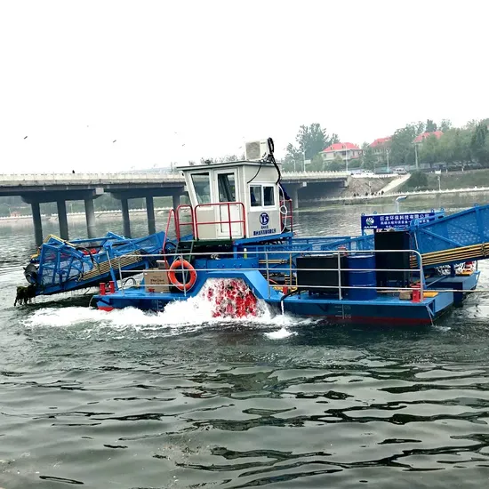 debris,aquatic plants in reservoirs,rivers,lakes and seashores.The harvesters are of easy operation,high efficiency and stable performance.One operator can complete the whole process of collecting,transmission,drainage,storage and discharge just by controlling the buttons and switches on the control desk.