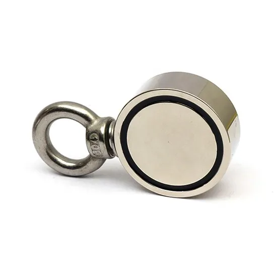 Product Description Extremely strong double sided rare earth neodymium magnetic fishing magnets (SM Series Model D) are used to salvage ferromagnetic metal products under the water with a rope tied on the hanging ring. Both sides of the fishing magnet (top and bottom sides) have magnetic attraction and the eyebolt is on the sided arc surface.They are also used as pot magnets for carpentry, metal kitchen utensils, exhibition stand construction, shopfitting, signage technology, etc. The cup shaped metal shells are designed to optimize the magnetic flux to make the pull force bigger. The standard magnet material is NdFeB N35 and standard surface treatment is nickel plating both for the magnet and metal shell.