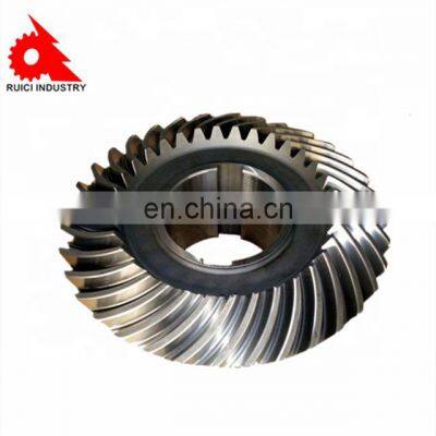 Helical bevel gear has high transmission efficiency, stable transmission ratio, large arc overlap coefficient, high bearing capacity, smooth transmission, reliable operation, compact structure, energy saving, space saving, abrasion resistance, long life, low noise.