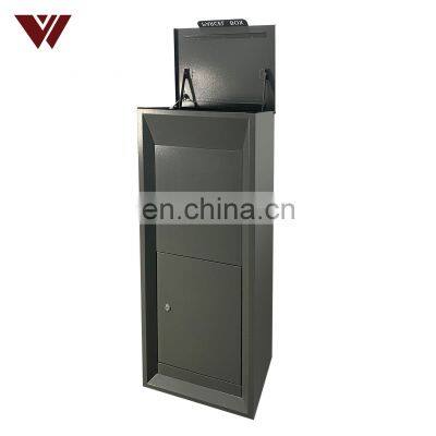 Product Description Say Goodbye to Sorry We Missed You Parcels This thick heavy gauge galvanized steel Parcel box has a tough scratch resistant powder coated finishExtra large mailbox size, it can hold several packagesSafety code lock or heavy duty lock with 2 keys to keep safeBolts securely to the ground. Mounting hardware not included Product NameHome Wall Mounted Mailboxes Smart Security Mailbox Metal Mailbox Parcel Drop Box MaterialSteel, stainless steelSurface finishPowder coatingSizeW400xD330xH1000ColorBlack, white, grey, custom colorLogo Custom logoFeaturesSafety and securely receive multiple parcel deliveries when you are not at homeWeight20kgsMOQ1pcsPackagingExpot standard packingPayment term40% deposit, balance before shipment Please contact us for more information. Packaging & Shipping Company Information WELDON is committed to provide high quality services to our customers and serviced many different industries, including Electronics, Medical, Communications, Rugged Systems and Commercial Industries, etc. We provide a wide range of services, which include:- CNC Turret Punch Press Stampings.- CNC Press Brakes.- CNC Shear.- CNC Machining Centers.- CAD - CAM Design.- Full Range of Sheet Metal Materials.- Welding: TIG, MIG and Spot Welding. ( Outstanding Quality )- Mechanical Assembly.- Silk - Screening and Deburring.- Bar Coding and JIT Delivery worldwide.We specialized in manufacturing all kinds of precise metal fabrication, including:laser cutting, stamping parts, bending parts, punching parts, welding parts accordingly clients drawings and specifications.OUR CERTIFICATES Weldon & Clients Our priority is the client satisfaction.To reach this goal we offer our best services and higher quality product.WELDON staff work as a big family, and Weldon treasure our friendship with every client. FAQ 1. Q: Are you a factory or trading company?A: We are manufacturer and trading company.2. Q: Where is your factory located? A: Our factory is located in Ningbo City, Zhejiang Province,China.All our clients, from domestic or abroad, are warmly welcome to visit us! 3. Q: How Can I Get A Sample? A: You can get samples by communicate with our export sales.4. Q: How Long Is Delivery?A: Sample Delivery time will be 7-10days.Mass production Delivery are 20-50days after sample confirmation.5. Q: What is the term of payment?A: Our normal payment terms now is: T/T,L/C, Paypal. In addition, the sample and its transportation costs can be paid by PayPal.6. Q: What Is The MOQ? A: MOQ depends on different items.7. Q: How Do I Order Your Products?A: You can check our website for any items you interest, and you can also getcommunication with our export sales and order for it accordingly.8. Q: What makes you different with others?A:1.Our Excellent ServiceWe promise to reply with a price within 24 hours - sometimes even within the hour.We will answer your questions immediately.2.Our quick manufacturing timeFor Normal orders, we will promise to produce within 5-35days. As a factory, we canensure the delivery time according to the formal contract.9. Q: Is OEM or ODM service available?A: Yes, we can provide OEM or ODM service to you and can put your logo on the goods.